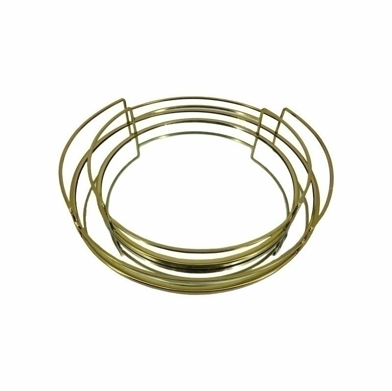 Bandeja espejada circular de vidrio con bordes dorados