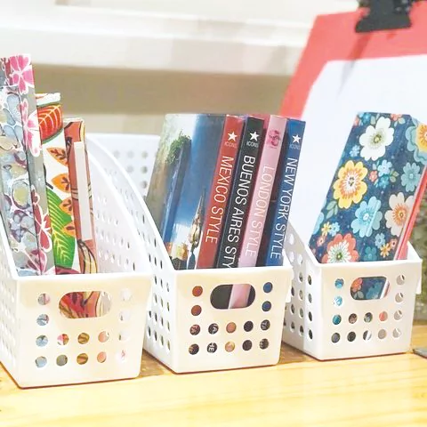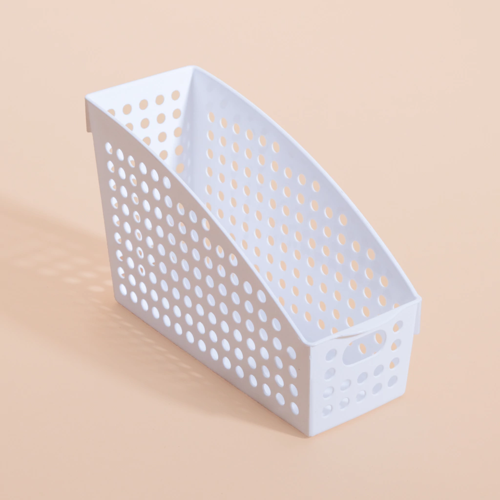 Contenedor plástico blanco multiuso tipo revistero para organizar cuadernos, libretas, papeles y demás en el escritorio. También puede ser usado en el baño para guardar aparatos como plancha para el pelo, secador, etc.