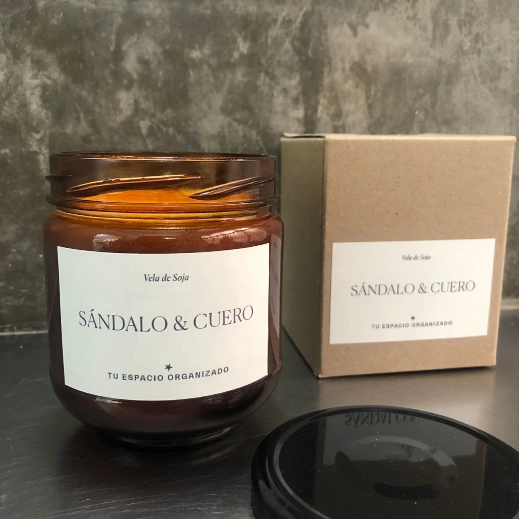 Vela aromatica de soja en frasco de vidrio para aromatizar tus ambientes aroma Sándalo y Cuero.